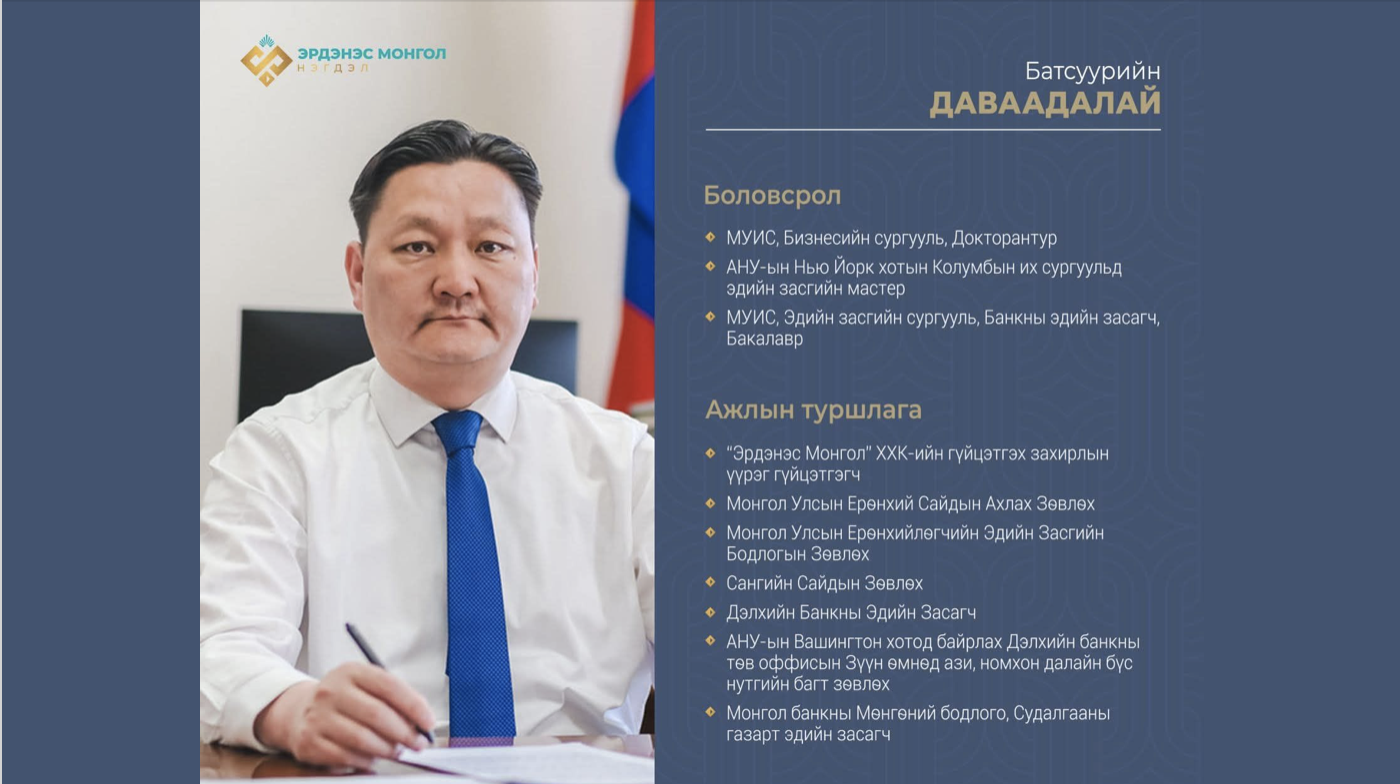 “Эрдэнэс Монгол” ХХК-ийн Төлөөлөн удирдах зөвлөлийн 2026 оны 02 дугаар сарын 13-ны тогтоолоор, нээлттэй сонгон шалгаруулалтын үр дүнг үндэслэн Б.Даваадалайг компанийн Гүйцэтгэх захирлаар томиллоо.