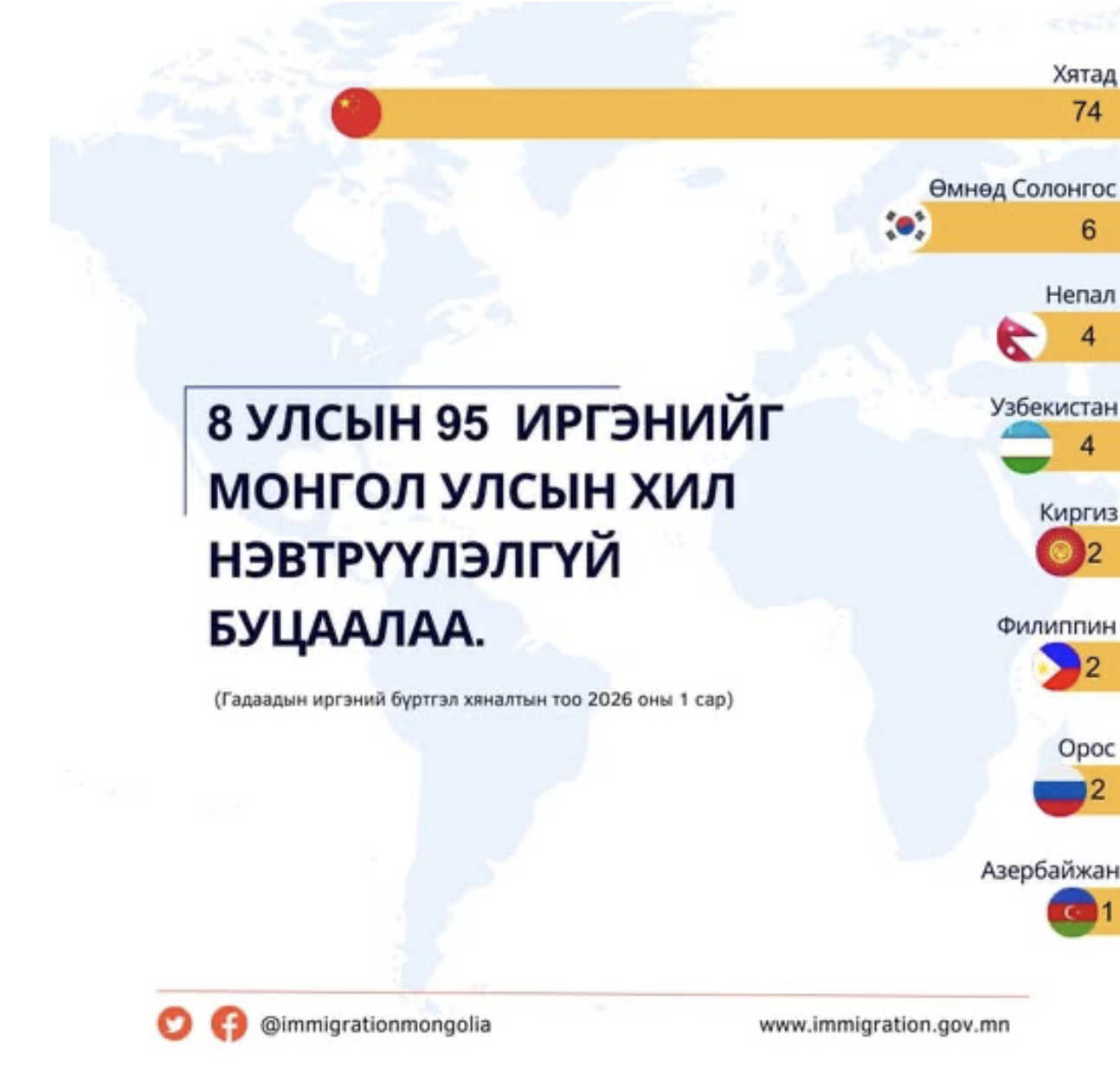 Гадаадын иргэн, харьяатын газар энэ оны нэгдүгээр сард 8 улсын 95 гадаадын иргэнийг улсын хилээр оруулалгүй буцаалаа.