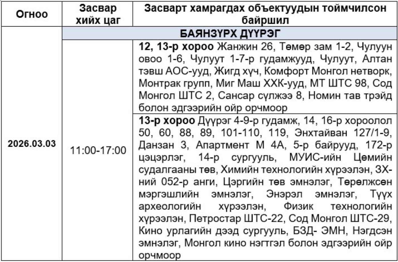 Цахилгааны шугам, тоноглолд засвар хийх болсон тул энэ сарын 3-31-ний хооронд хэсэгчилсэн хязгаарлалт хийх хуваарийг "УБЦТС" ТӨХК-иас танилцууллаа. Цаг агаарын байдлаас шалтгаалан хуваарьт өөрчлөлт орох тохиолдолд гэрээнд бүртгэгдсэн утасны дугаарт мэдээллийг хүргэх аж.