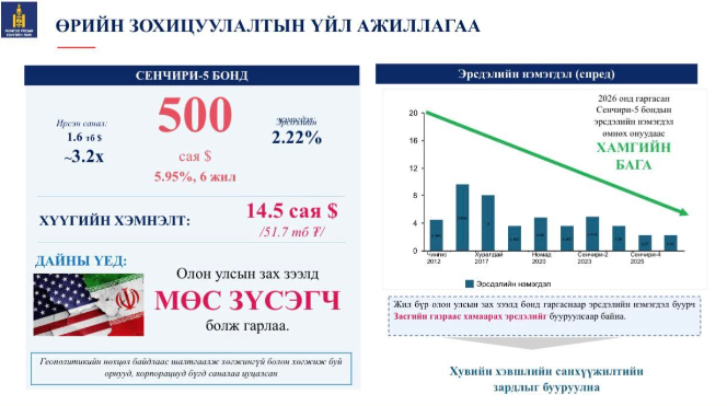 Нийт 500 сая ам.долларын бондыг 6 жилийн хугацаатай, 5.95 хувийн хүүтэйгээр амжилттай арилжаалан, 2026 онд төлөгдөх 5.125 хувийн хүүтэй “Номад” бонд, 2028 онд төлөгдөх 8.65 хувийн хүүтэй “Сенчири-2” бондоос 321.6 сая ам.долларыг тус тус буцаан худалдан авах өрийн зохицуулалтыг хийжээ.