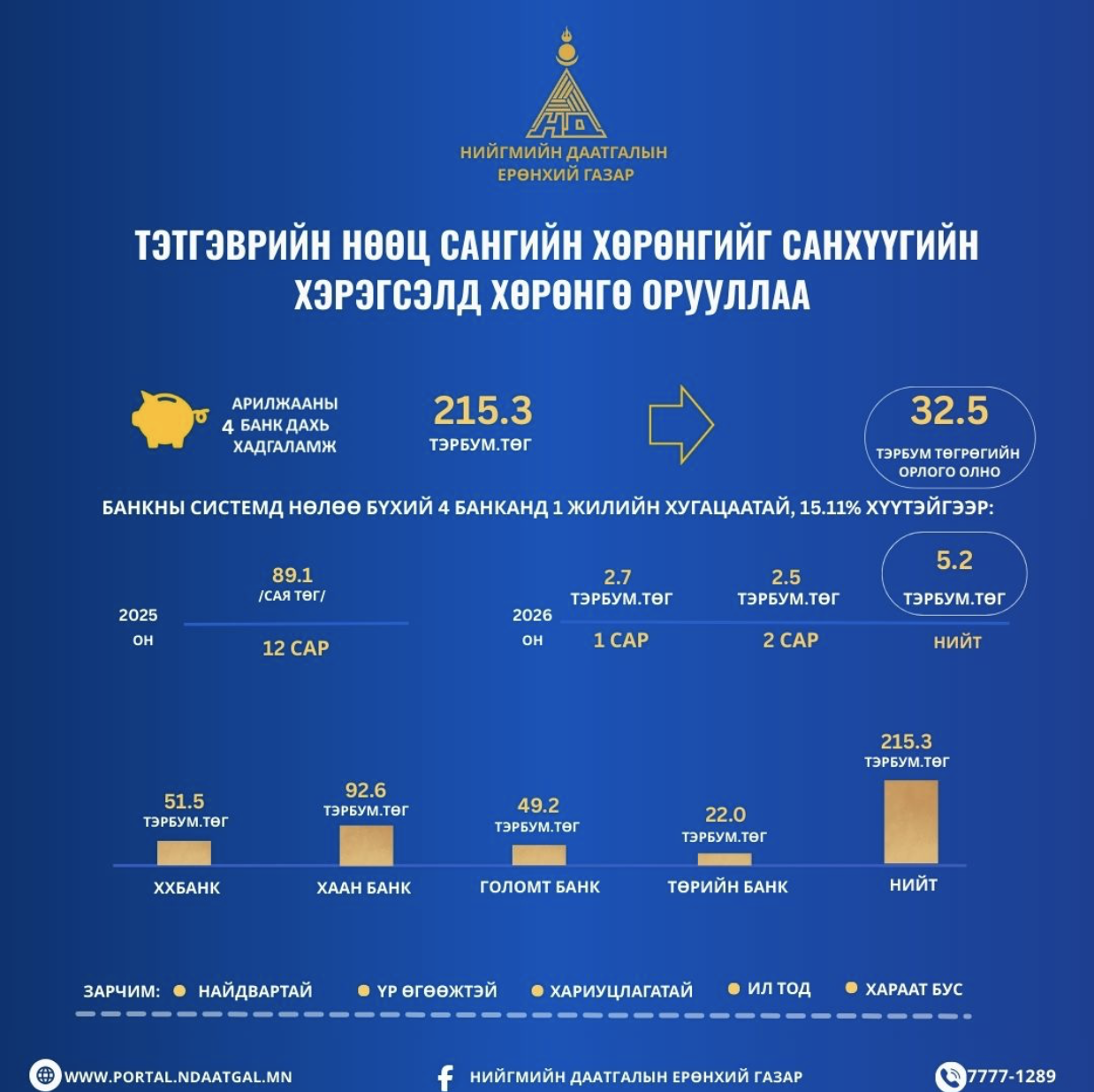 Банкны системд нөлөө бүхий арилжааны 4 банканд 2025 оны 12 дугаар сарын 31-ний өдөр “Мөнгөн хадгаламжийн гэрээ” байгуулан тэтгэврийн нөөц сангийн 215.3 тэрбум төгрөгийг нэг жилийн хугацаатай, жилийн 15.11 хувийн хүүгийн өгөөж хүртэх нөхцөлтэйгөөр хадгаламж хэлбэрээр байршуулсан.