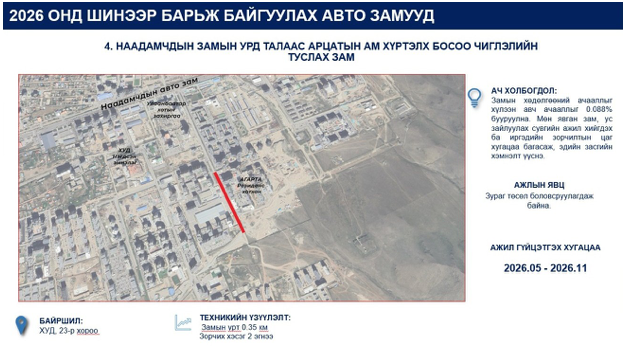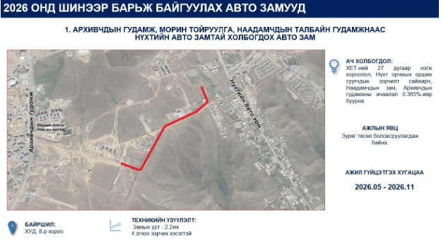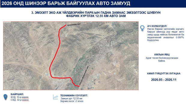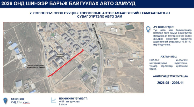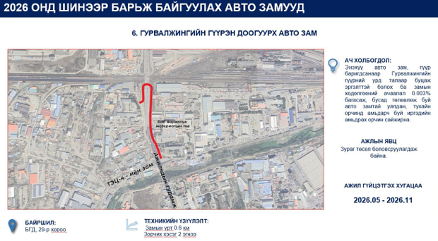 Мөн хоёр байршилд явган хүний гүүрэн гарц, хоёр байршилд 31 км гэрэлтүүлэг хийх юм. Энэ хүрээнд 2026 онд шинээр барьж байгуулах авто зам болон авто замын байгууламжийн талаар мэдээлэл хүргэж байна.