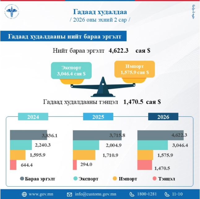 Гаалийн ерөнхий газрын мэдээлснээр, гадаад худалдааны бараа эргэлт оны эхний 2 сарын дүнгээр 4622.3 сая ам.доллар болсон нь өнгөрсөн оны мөн үеийнхээс 906.5 сая ам.доллар буюу 24.4 хувиар нэмэгджээ.