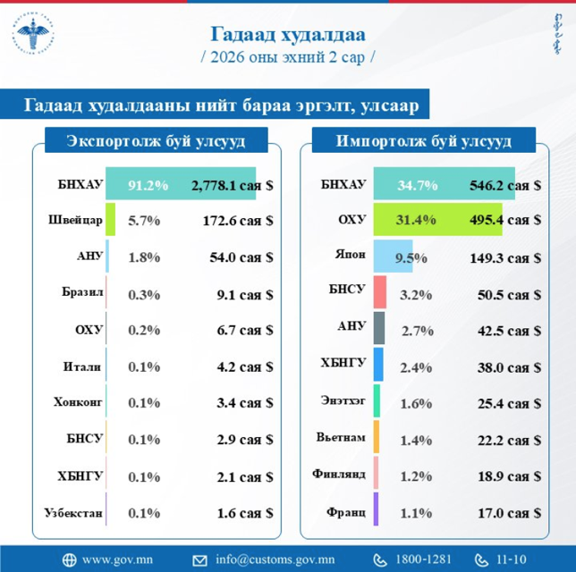 Манай улсын экспортын дүн энэ оны эхний хоёр сарын байдлаар импортынхоос 1470.5 сая ам.доллароор давж, гадаад худалдааны баланс эерэг гарлаа.
