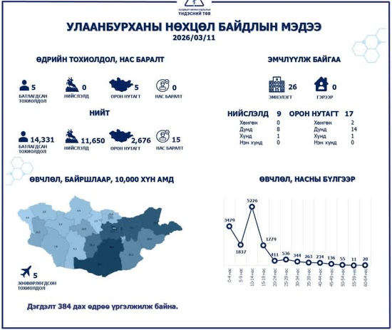 Улаанбурхан өвчний батлагдсан тохиолдол улсын хэмжээнд 14.331 хүрээд байгаа бөгөөд нийслэлд 11650, орон нутагт 2676 бүртгэгдсэн байна. Халдварт өвчин судлалын үндэсний төвөөс гаргасан 2026 оны гуравдугаар сарын 11-ний мэдээллээр Улаанбурхан өвчний батлагдсан тохиолдол 5 нэмэгджээ. Одоогийн байдлаар эмнэлэгт 26 хүн хэвтэн эмчлүүлж байгаа.