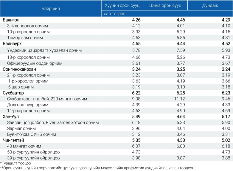 Орон сууцны 1 сарын түрээсийн дундаж үнийг байршлаар нь харвал, 1-3 өрөө байрны хувьд Сүхбаатар дүүрэгт Сүхбаатарын талбай, 220 мянгат орчим 1.40-4.61 сая байгаа нь хамгийн өндөр, Сонгинохайрхан дүүрэгт 5 шар орчим 1.0-1.5 сая төгрөг байгаа нь хамгийн хямд байна.
