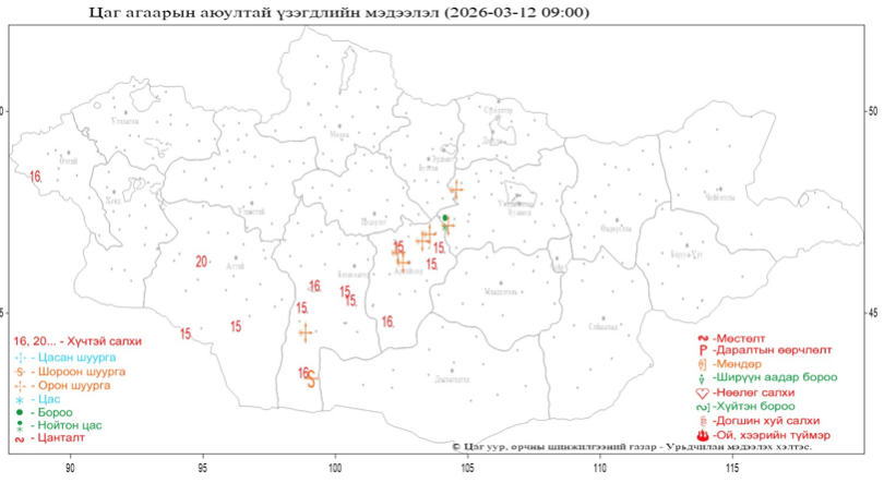 Цаг уурын байгууллагын мэдээлснээр өнөөдөр төвийн аймгуудын ихэнх нутгаар, говийн аймгуудын хойд хэсгээр, зүүн аймгуудын баруун хэсгээр нойтон цас орж цасан шуурга шуурах төлөвтэй байна. Харин гуравдугаар сарын 13-нд нутгийн зүүн хагаст цас орж, цасан шуурга шуурах бөгөөд нутгийн өмнөд хэсгээр хүчтэй салхи салхилж, шороон шуурга шуурч үзэгдэх орчин хязгаарлагдахыг анхааруулж байна.