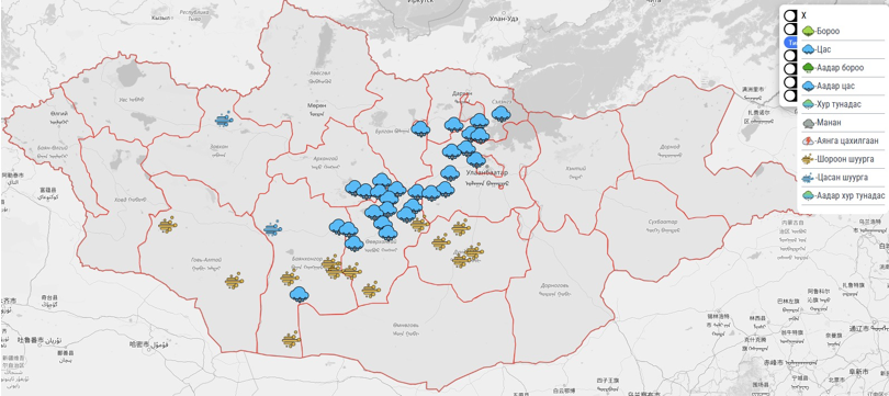 Мөн Баянхонгор аймгийн Хүрээмарал, Завхан аймгийн Баянхайрхан сумдын нутгаар цасан шуурга шуурч байгаа бол Баянхонгор аймгийн Баянцагаан, Богд, Жинст, Эхийнгол, Говь-Алтай аймгийн Баянтоорой тосгон, Дарви, Дундговь аймгийн Адаацаг, Луус, Сайнцагаан, Эрдэнэдалай, Өвөрхангай аймгийн Баруунбаян-Улаан, Баян-Өндөр, Богд сумдын нутгаар шороон шуурга шуурч байна.