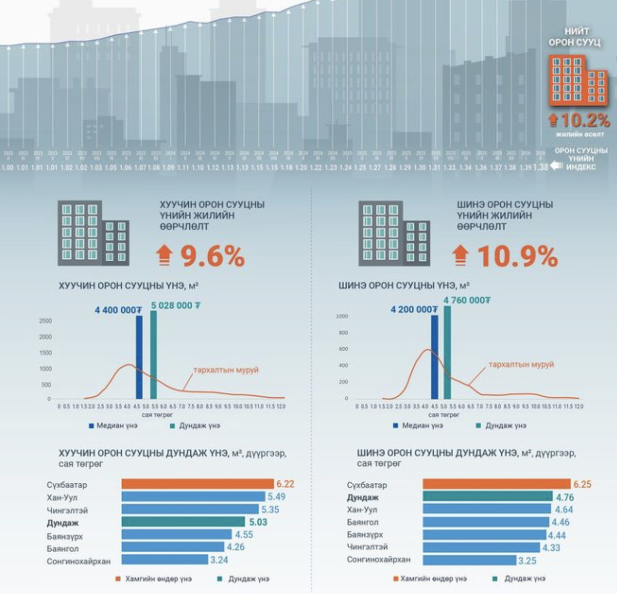Шинэ орон сууцны үнэ өмнөх оны мөн үеэс 10.9 хувиар өсөж, өмнөх сараас 2.8 хувиар буурсан бол хуучин орон сууцны үнэ өмнөх оны мөн үеэс 9.6 хувиар өсөж, өмнөх сараас 0.4 хувиар буурсан байна.