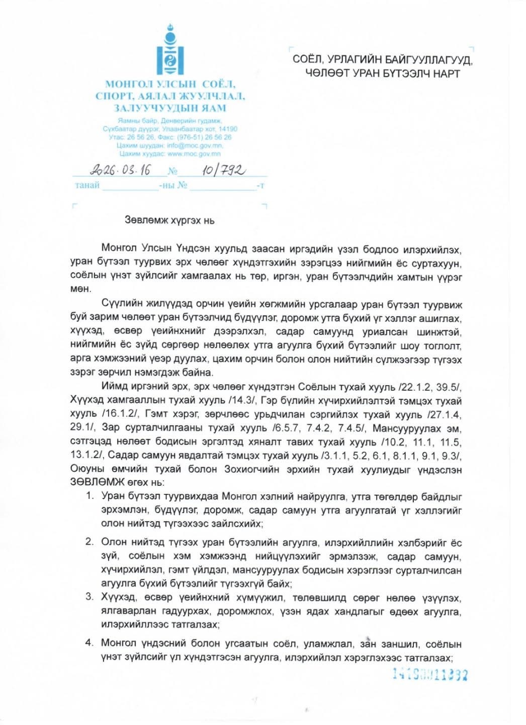 Иймд иргэний эрх, эрх чөлөөг хүндэтгэн холбогдох хууль тогтоомжид үндэслэн соёл урлагийн байгууллагууд болон чөлөөт уран бүтээлчдэд дараах зөвлөмжийг хүргүүлсэн байна. Үүнд уран бүтээлдээ Монгол хэлний найруулга, утга төгөлдөр байдлыг эрхэмлэх, бүдүүлэг болон садар самуун агуулга түгээхээс зайлсхийх, ёс зүй соёлын хэм хэмжээг баримтлахыг онцолжээ.