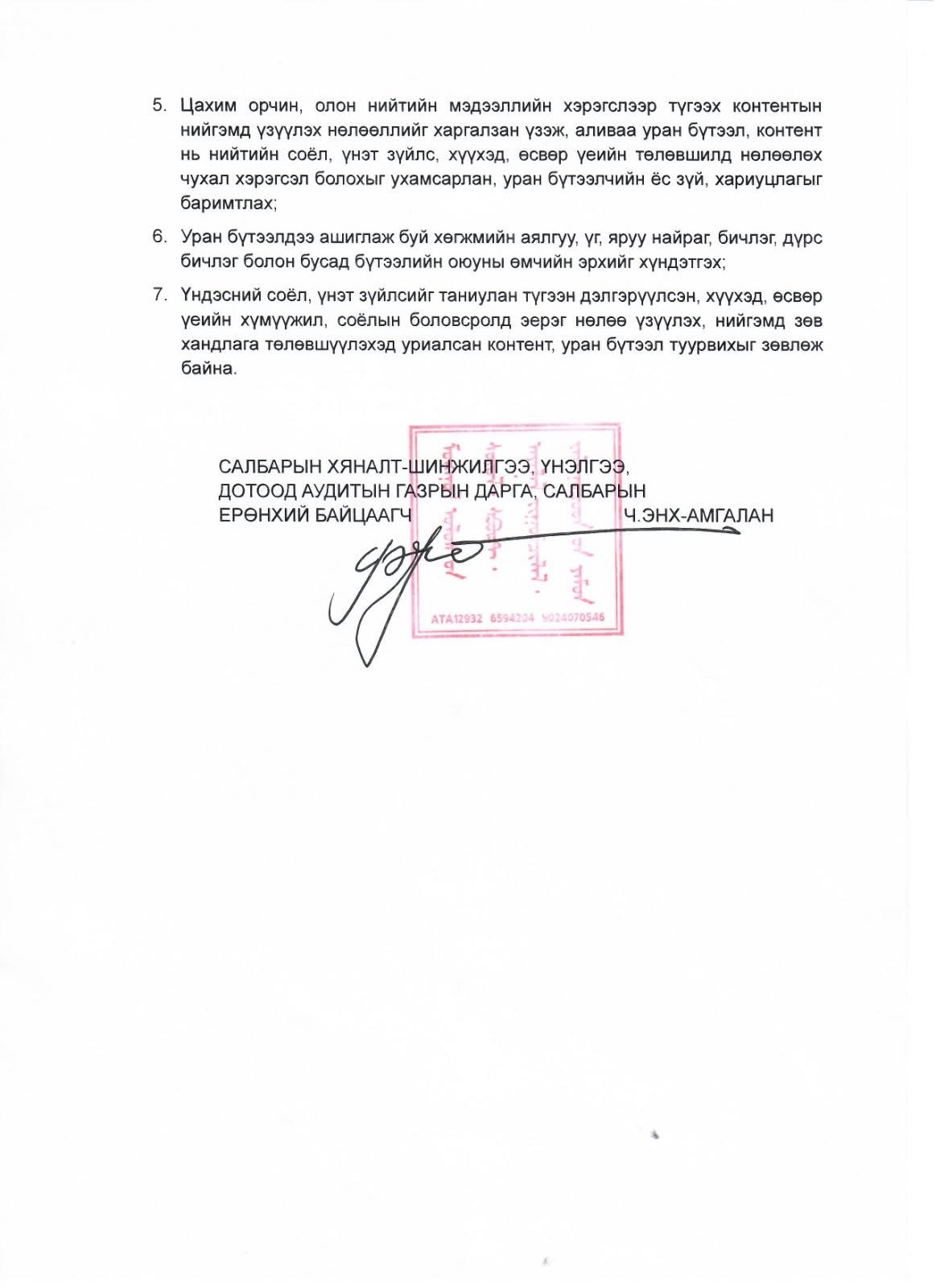 Түүнчлэн цахим орчинд түгээх контентын нийгэмд үзүүлэх нөлөөллийг тооцож, уран бүтээлчийн ёс зүй, хариуцлагыг баримтлах, оюуны өмчийн эрхийг хүндэтгэх шаардлагатайг сануулжээ. Харин үндэсний соёл, зөв хандлагыг түгээн дэлгэрүүлэх, хүүхэд залуусын соёлын боловсролд эерэг нөлөө үзүүлэх уран бүтээл туурвихыг уриалсан байна.