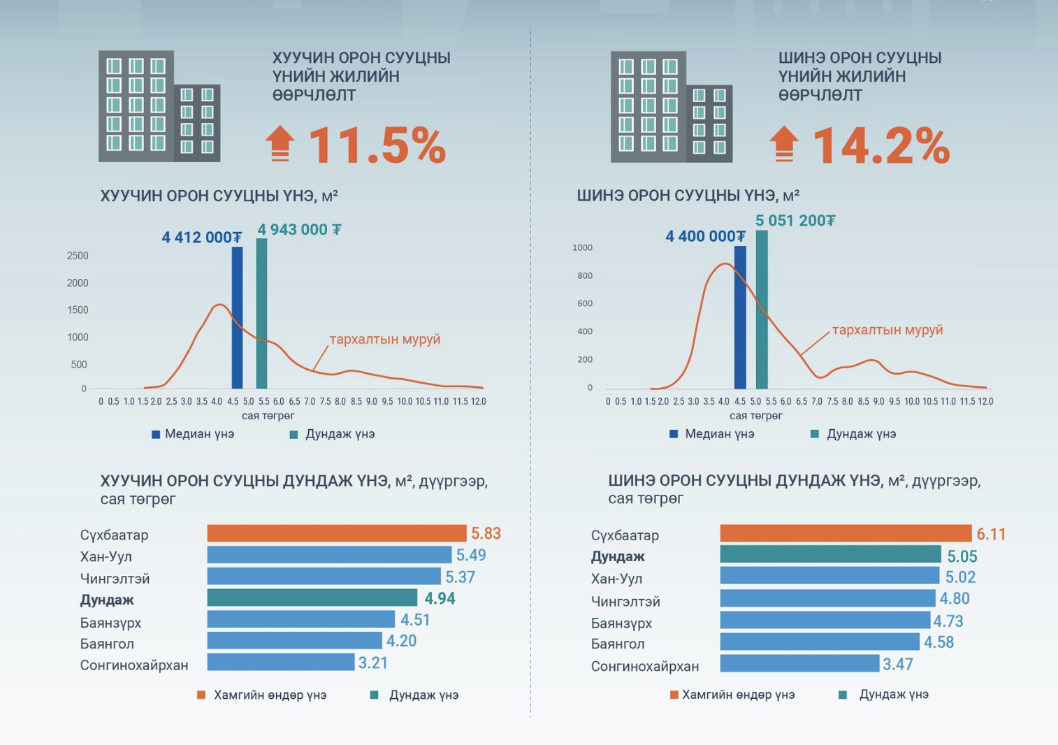 Тодруулбал, 2026 оны нэгдүгээр сард шинэ орон сууцны 1 метр квадрат талбайн дундаж үнэ 5.05 сая төгрөг болж, Сүхбаатар дүүрэгт хамгийн өндөр буюу 6.11 сая төгрөгийн үнэтэй байна. Шинэ орон сууцны дундаж үнэ өмнөх оны мөн үетэй харьцуулахад Баянзүрх дүүрэгт 18.0 хувиар өссөн нь хамгийн өндөр, Сонгинохайрхан дүүрэгт 0.7 хувиар өссөн нь хамгийн бага байна. Мөн 2026 оны нэгдүгээр сард хуучин орон сууцны 1 метр квадрат талбайн дундаж үнэ 4.94 сая төгрөг болж, Сүхбаатар дүүрэгт хамгийн өндөр буюу 5.83 сая төгрөгийн үнэтэй байна. Хуучин орон сууцны дундаж үнэ өмнөх оны мөн үетэй харьцуулахад Хан-Уул дүүрэгт 16.5 хувиар өссөн нь хамгийн өндөр, Сүхбаатар дүүрэгт 0.2 хувиар өссөн нь хамгийн бага байна.
