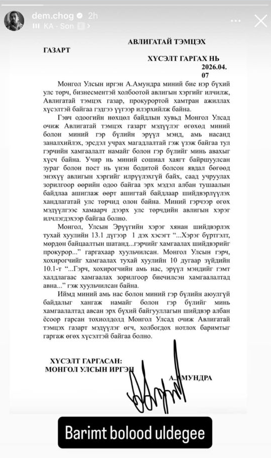 МАН-ын гишүүнчлэлээс хөөгдөөд буй А.Амундра АТГ-т хүсэлт гаргажээ. Тэрбээр өдгөө эх орондоо байхгүй ч өөрийн инстаграмаараа дамжуулан гэмт хэргийн шинжтэй мэдээллүүдийг дэлгэсээр байгаа юм.